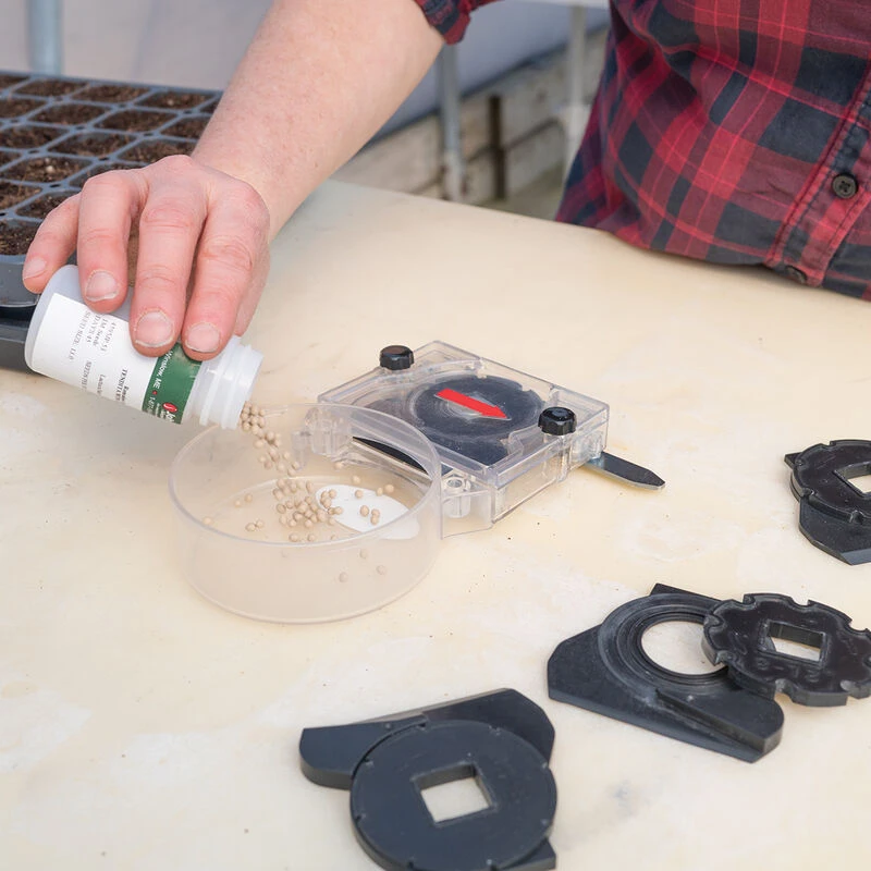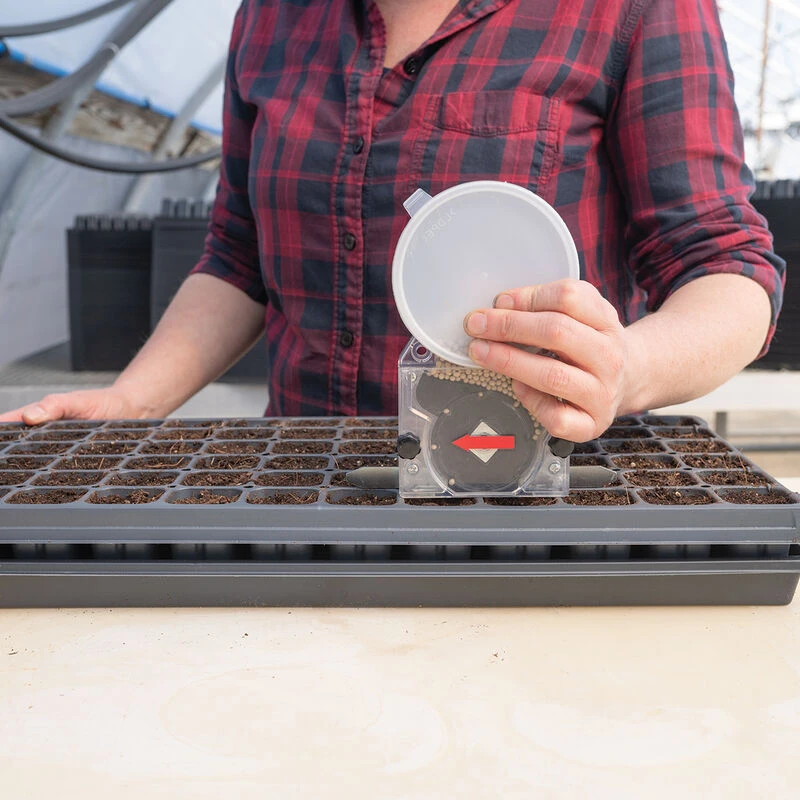 Designed for seeding standard cell trays. (Compatible with 50, 72, 128, and 200-cell trays.) A specialized cleat catches the edge of each cell in the tray and sows the seed as you move across the row. Simple design makes this seeder easy to empty and clean.